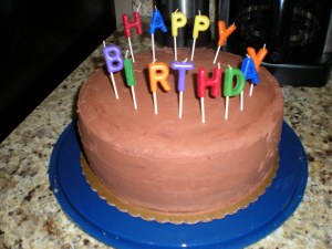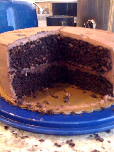 I decided to go with a chocolate ganache for the topping and filling, courtesy of Alton Brown of course! I jumped forward a couple of seasons for this recipe, but I wouldn’t have it any other way. The cake was so moist and yummy thanks to Julia and the ganache was to die for! The easy thing about this recipe is making it in the food processor, sounds weird I know but it was so good. I let it cool and put it in between the layers of the cake and then I whipped it up for a lighter, fluffier frosting for the outside of the cake. I got to use my turntable that Julia gave to me a few weeks ago for the first time and I loved it! I don’t really know how to decorate cakes yet, but it sure helped out with the layer of frosting. It was so good and chocolaty, just how he likes it!