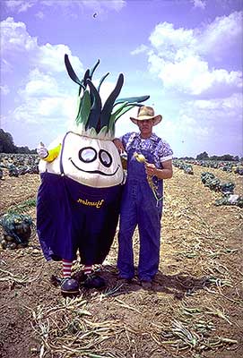 Mr. Yumion explains to us in this episode that fresh onions get their sweetness from the soil that has very low amounts of sulfur. I mean come on…how can you not love Alton Brown with a Mr. Yumion character 🙂The best way to store onions is to hang them from a pair of pantyhose in a cool dry place. Tie knots between each onion so all you do is cut one or two off as you need them. Never store onions next to potatoes. They do not get along. If you’re storing half an onion be sure to put it in an air tight resealable bag as the refrigerator has a ton of moisture in it. Moisture=rotting onions.