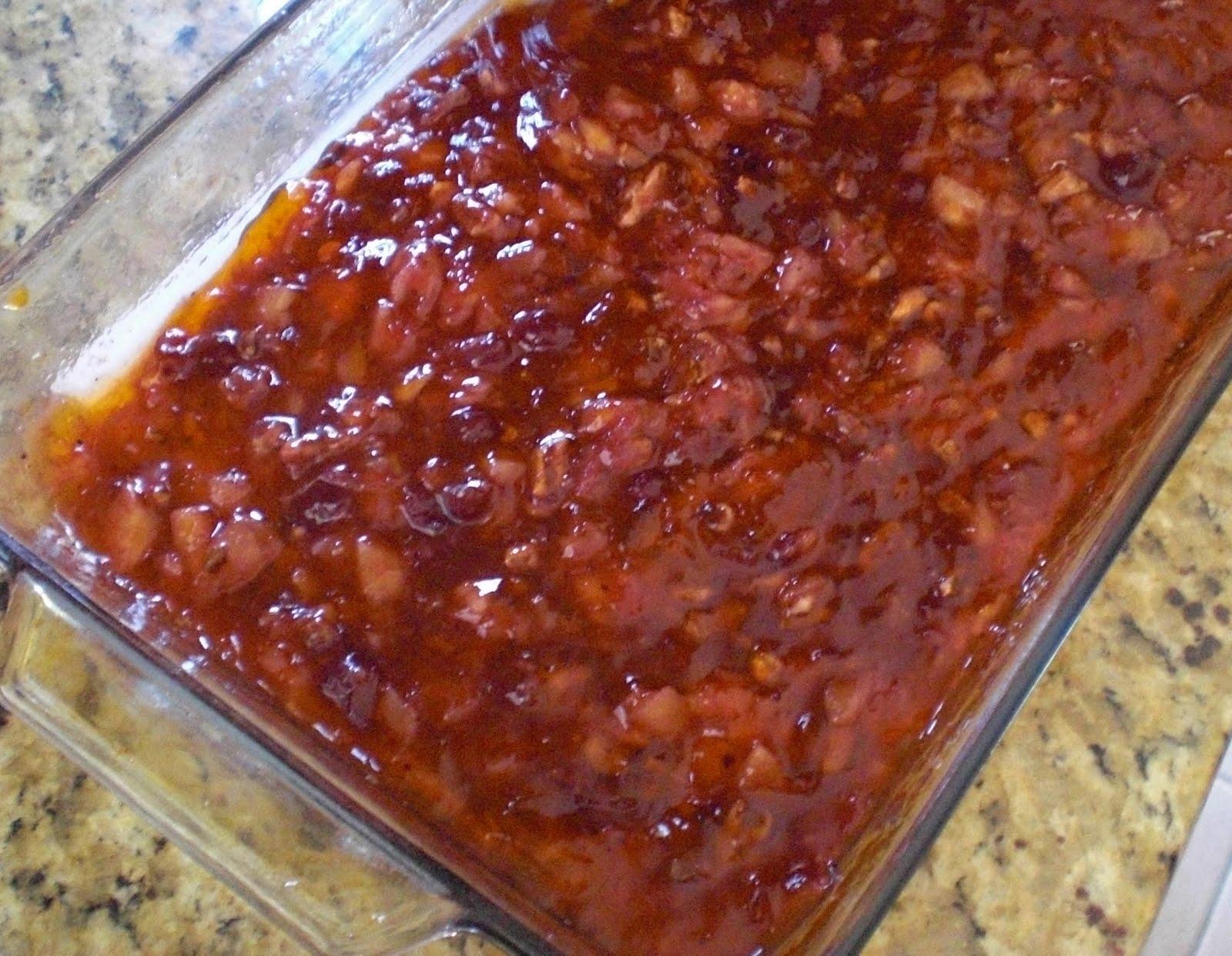 Combine the canned pineapple and its juice, with the pecans and the whole cranberry sauce.