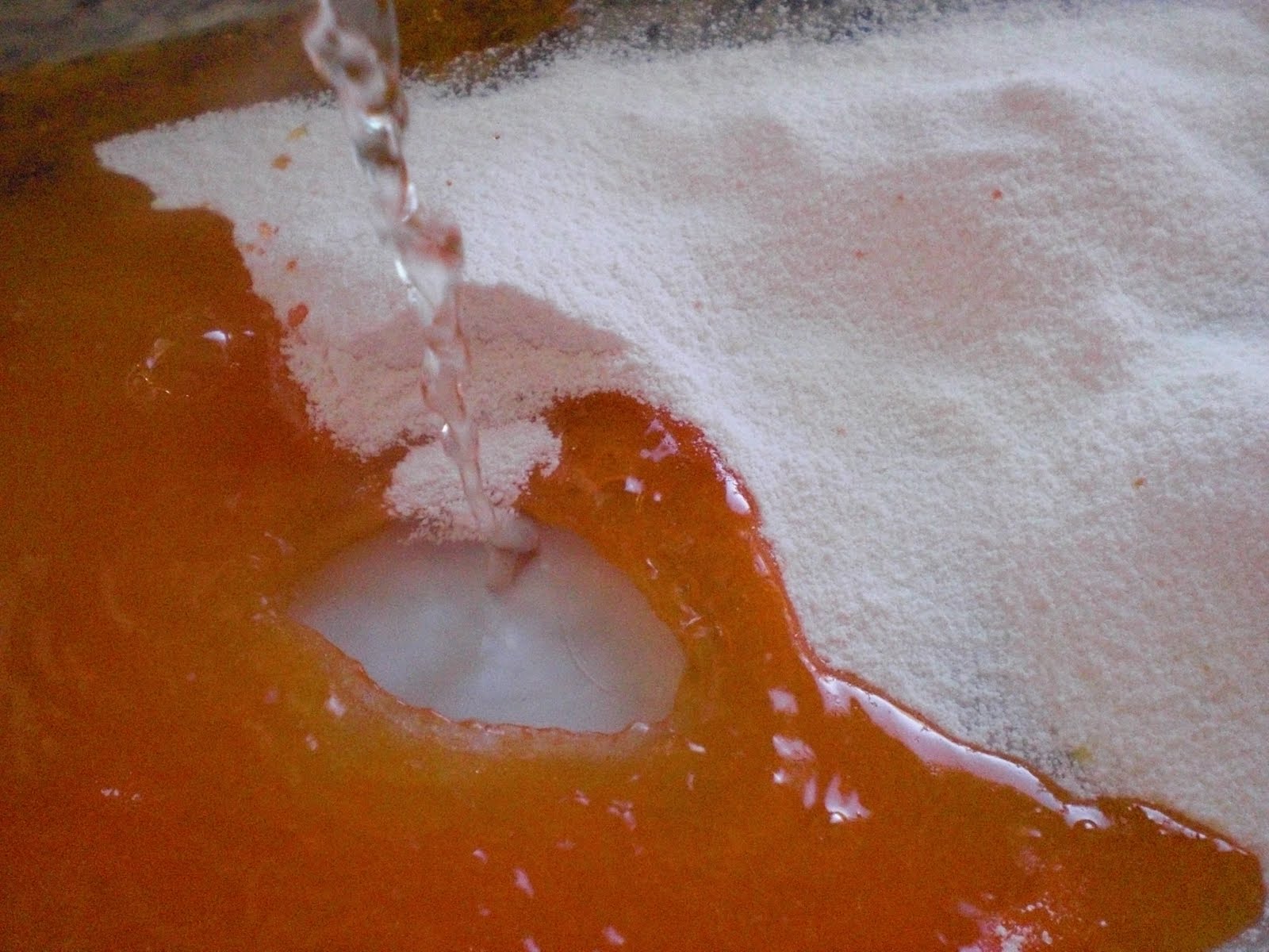 Sprinkle the gelatins in a 9 by 13 glass-baking dish and slowly stir in the boiling water.