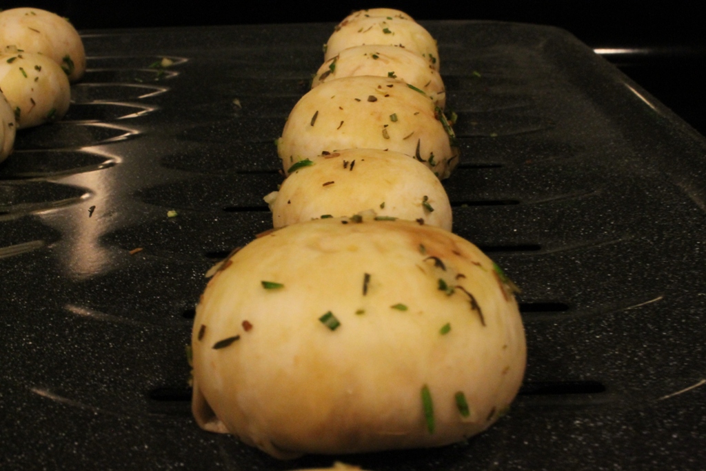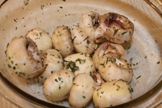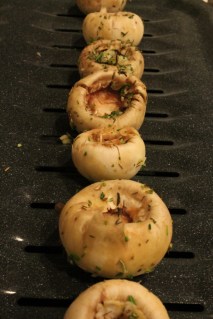 In a large bowl, toss the mushroom caps with enough olive oil to coat the caps. Add the rosemary, thyme, and garlic and combine thoroughly.