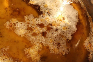 Skim the foam from the top, and slowly pour into a container, discarding the milky solids in the bottom of pan.