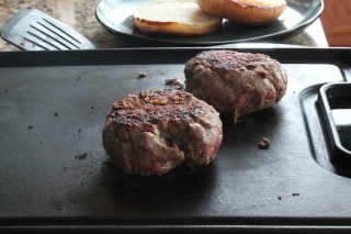 Heat a cast iron griddle over medium-high heat for 2 to 3 minutes. Place the hamburger patties on the griddle. Cook patties for 5 minutes on each side for medium burgers.