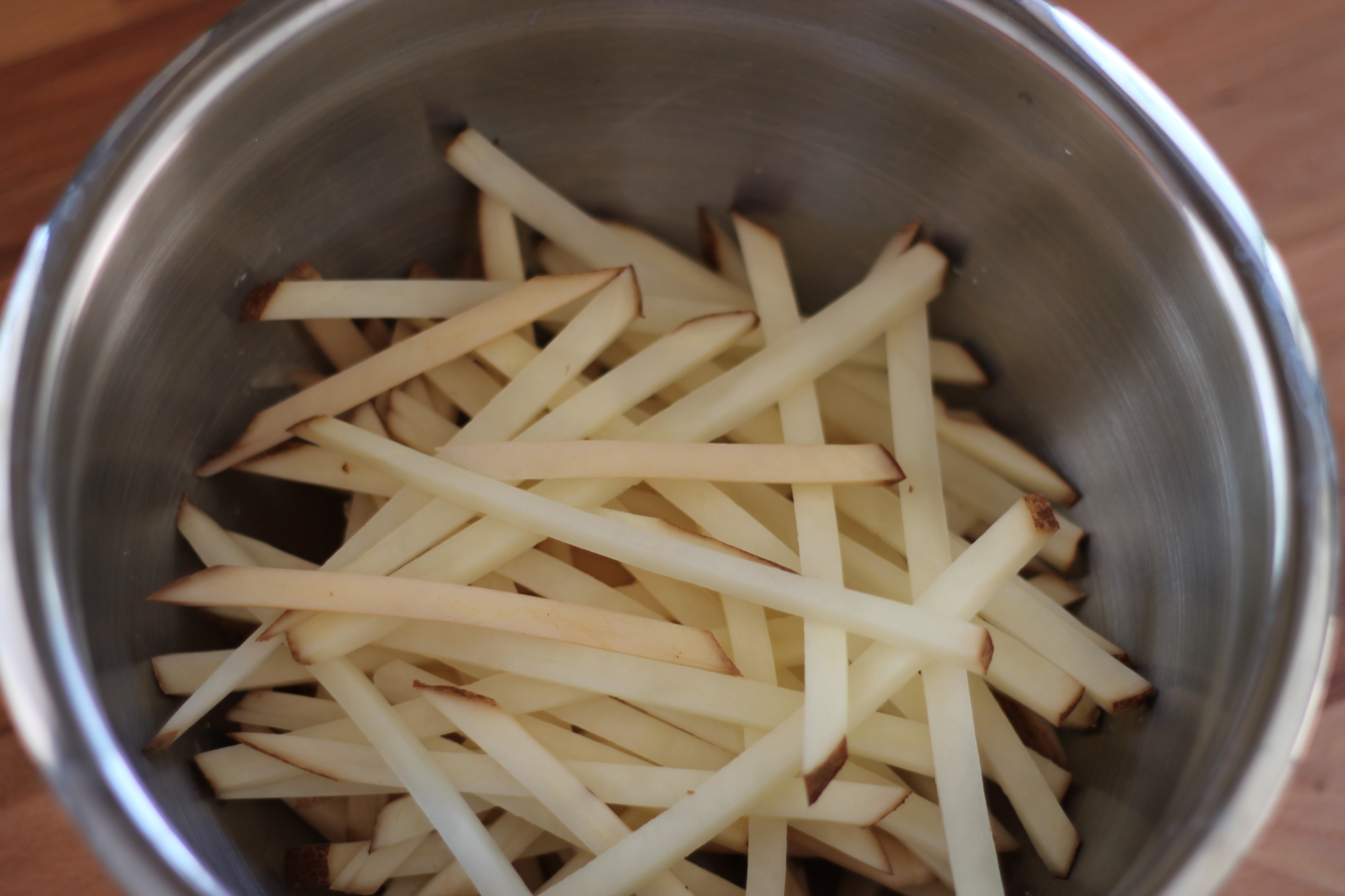 Get your potatoes and mandolin. You don’t have to have this, but it makes frying more even by ensuring each piece is the same size. If AB says I need one, I don’t argue. Also note, one potato per person.