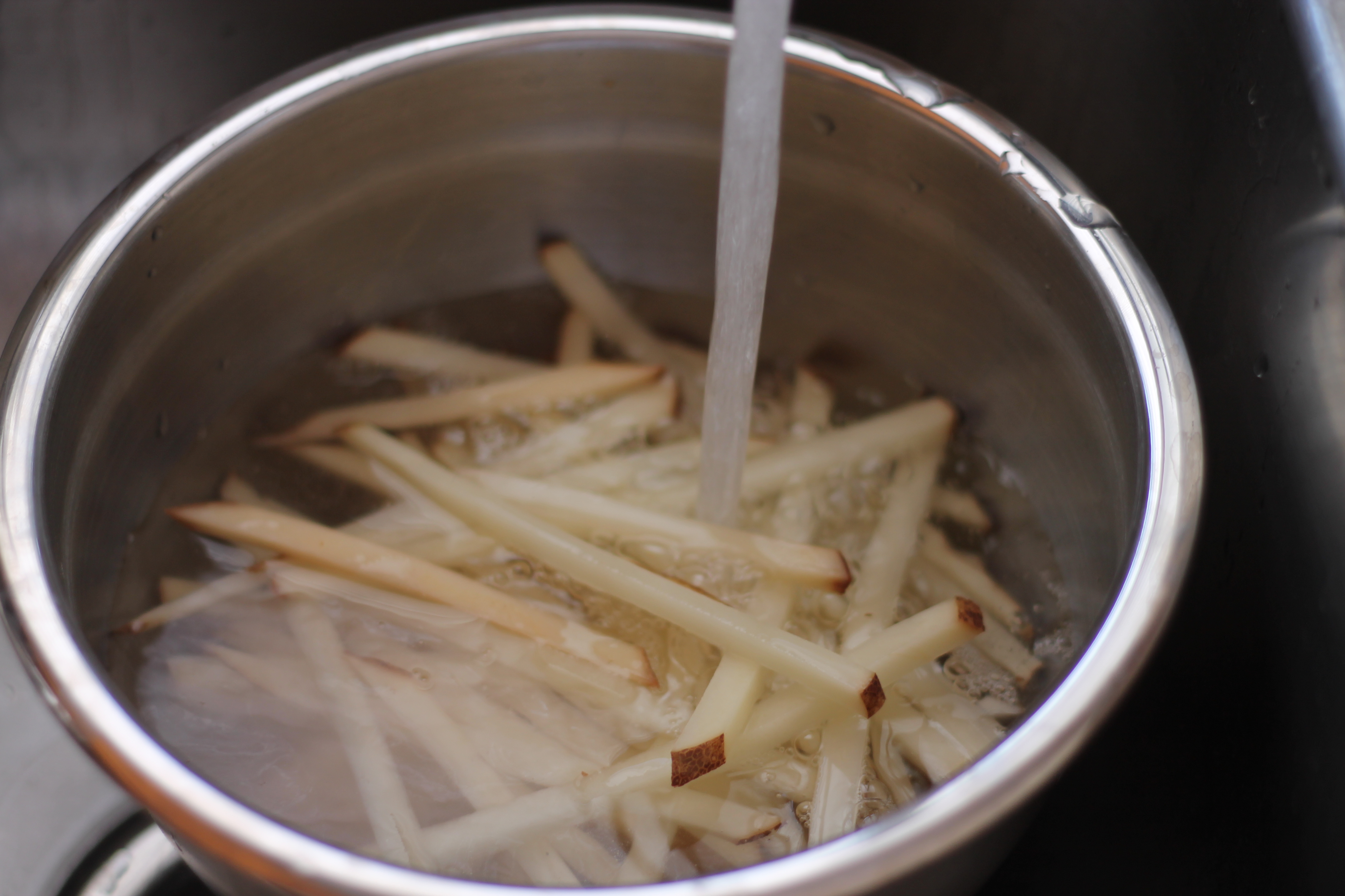 Drain potatoes thoroughly, removing any excess water. When oil reaches 320 degrees, submerge the potatoes in the oil. Working in small batches, fry for 2 to 3 minutes until they are pale and floppy. Remove from oil, drain, and cool to room temperature.