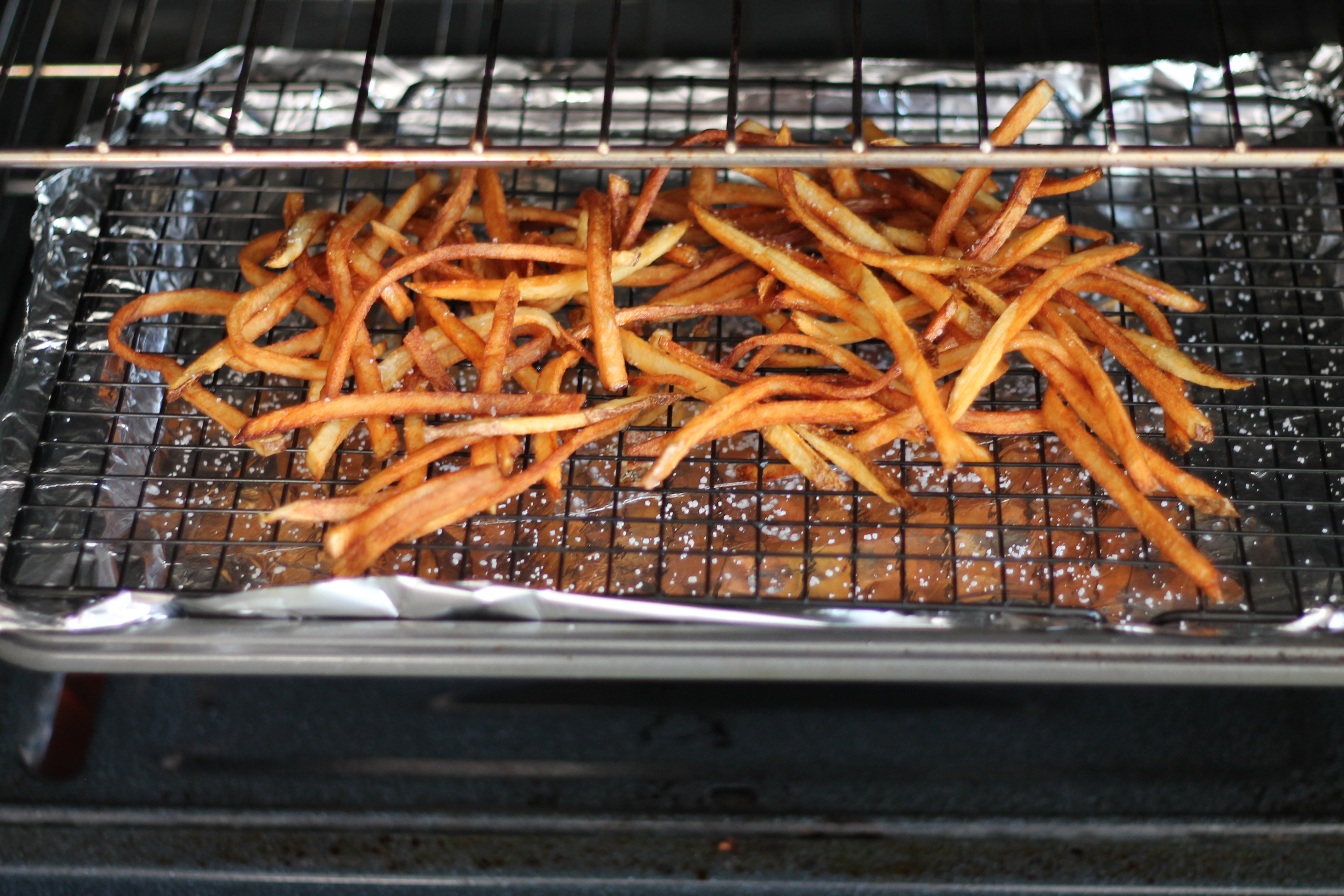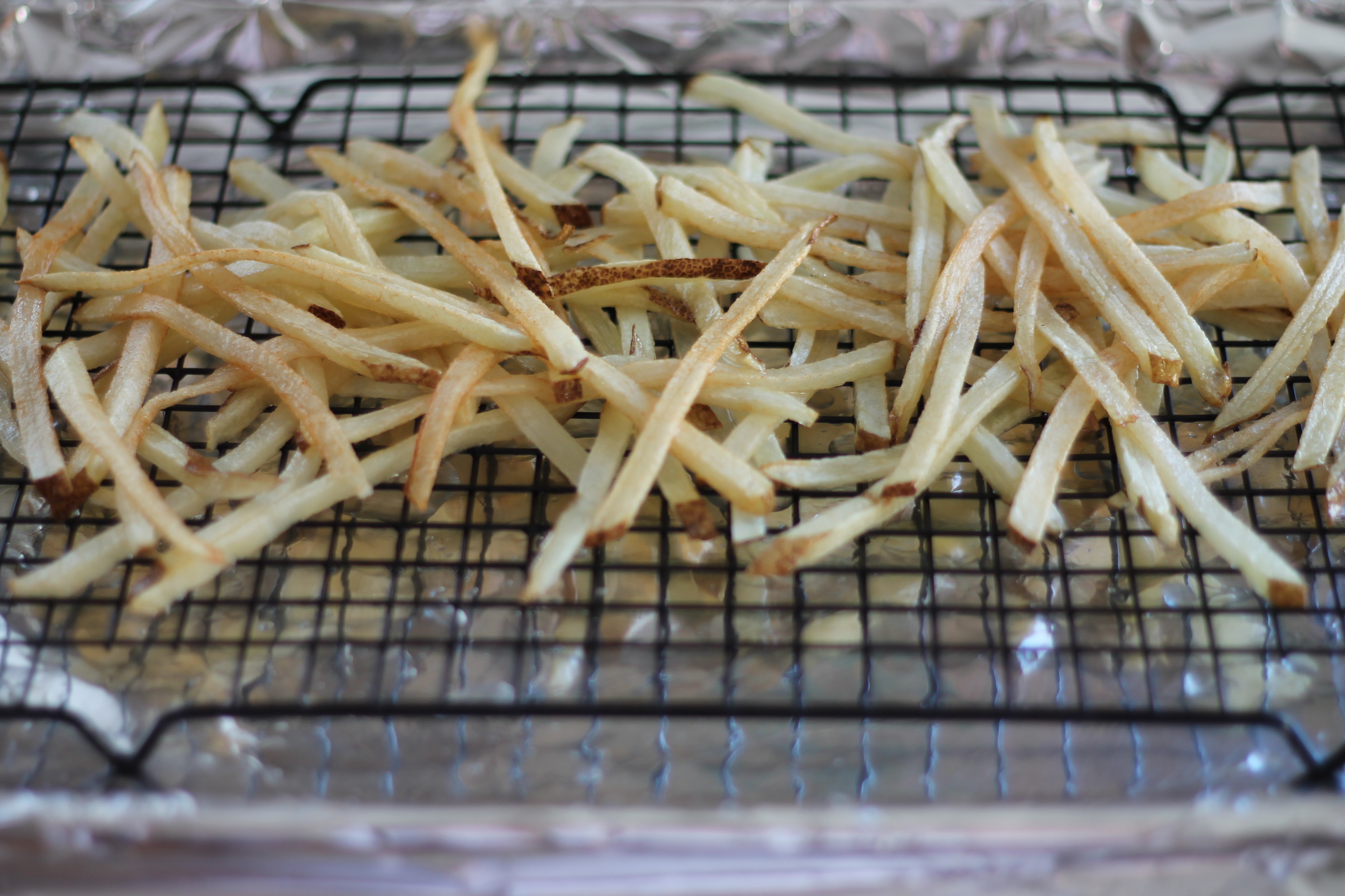 Increase the temperature of the oil to 375 degrees. Re-immerse fries and cook until crisp and golden brown, about 2 to 3 minutes. Remove and drain on roasting rack. Season with kosher salt while hot and hold in the oven.