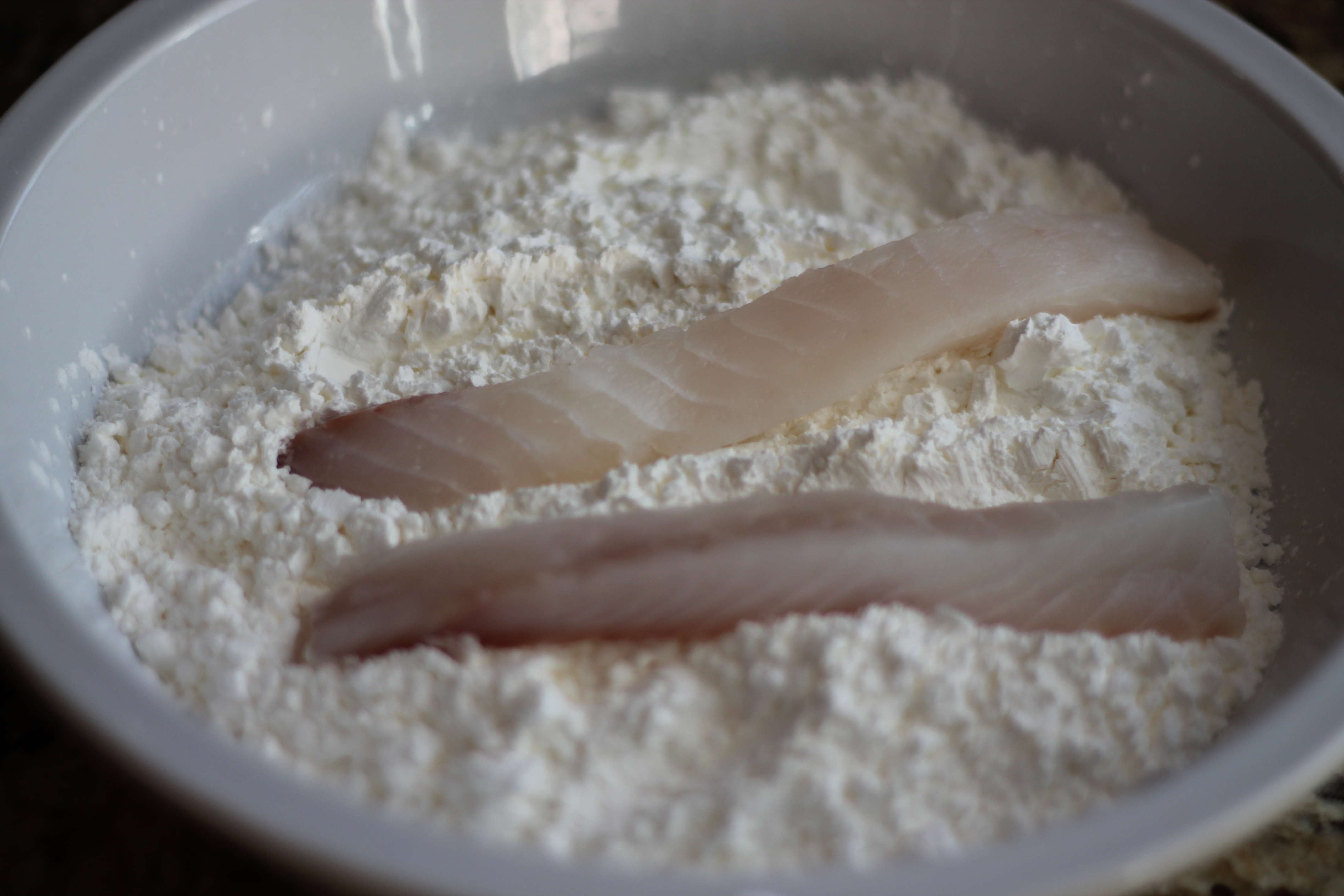 Let the oil cool back down to 350 degrees. Cut your fish into 1″ strips, dredge in cornstarch, shake off excess, then dip in the beer batter and fully coat.