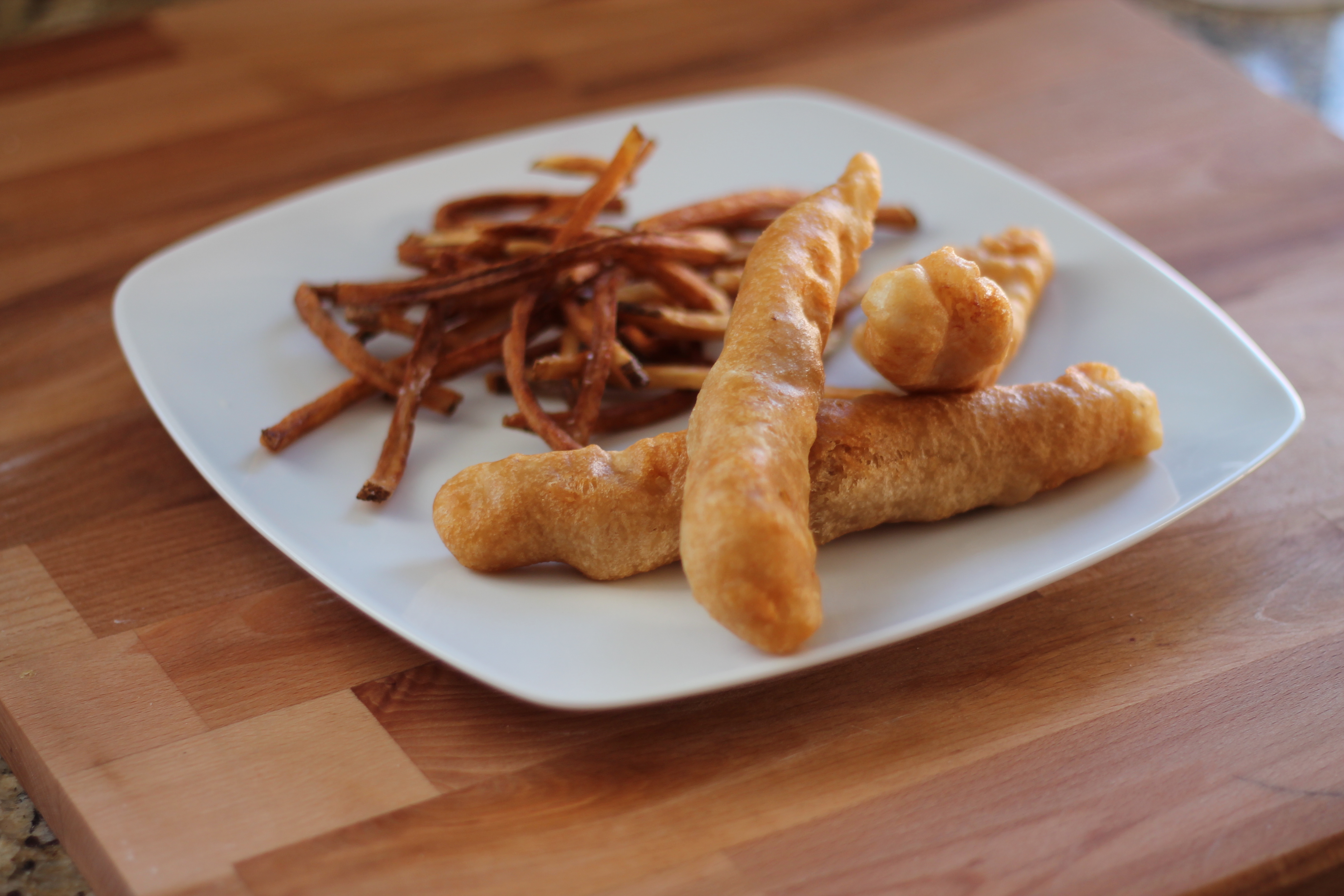 Fry Hard is definitely an appropriate title for this episode. I’m not sure how long it will take to get the fry smell out of my house, but it was totally worth it! We fried potatoes and fish a.k.a. Chips and Fish. I was also able to try for the first time my new V-slicer Mandolin. I’ll have a review later on my other blog here about it. I’m not a big fish eater and getting one that doesn’t taste like fish in the desert is sometimes a challenge. I also have to have fresh caught. There’s just something about fish farming that gives me the creeps! Trader Joe’s never disappoints. For this recipe I picked up a nice piece of Alaskan, fresh caught Cod. You could also use Halibut, Pollock or any firm white fish. Alton doesn’t recommend using Tilapia unless you really hate fish. I used peanut oil instead of safflower oil because it would have cost me $50, and I don’t have AB’s budget. These were definitely Good Eats! Also great for fish tacos as a leftovers idea.